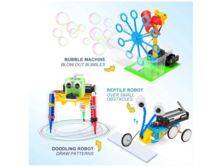• Features bubble machine, reptile robot, balance robot, doodling robot, buzz wire game, and fiber optic lamp.